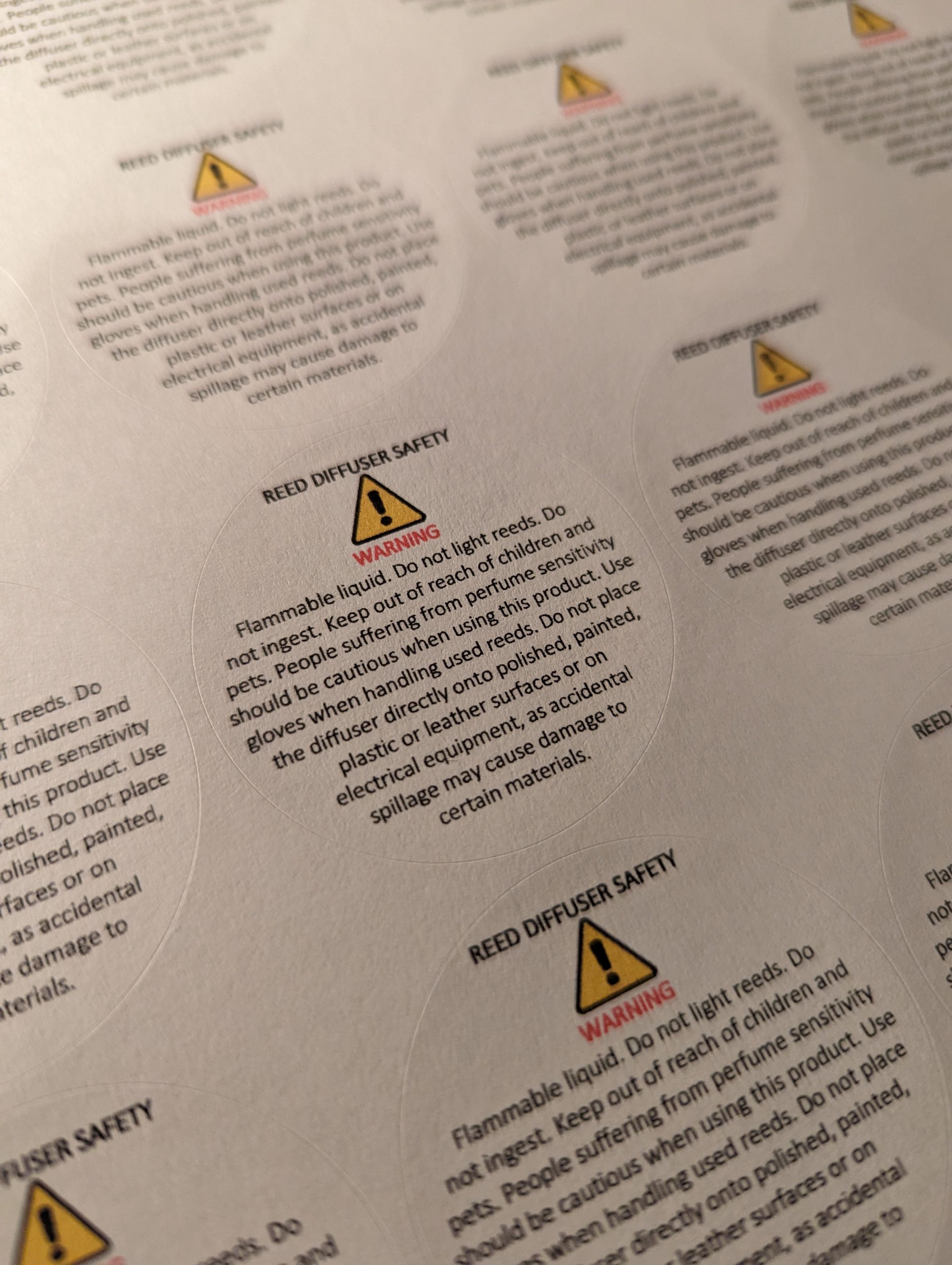 We print safety labels for candles, wax melts, diffusers and room sprays. There are 24 round 45mm labels per sheet.